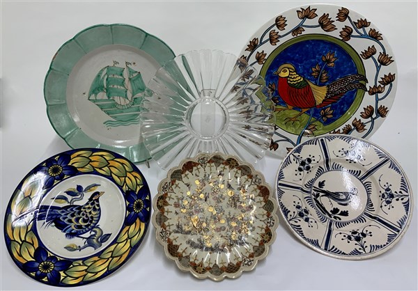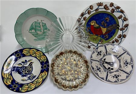 Lotto composto da un piatto giapponese Meiji, uno della manifattura di Vietri e quattro di epoche e materiali differenti (difetti)