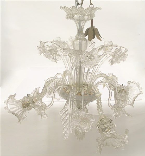 Manifattura di Murano. Lampadario a quattro fiamme in vetro incolore decorato a fiori e foglie (difetti e mancanze) (h. cm 80)