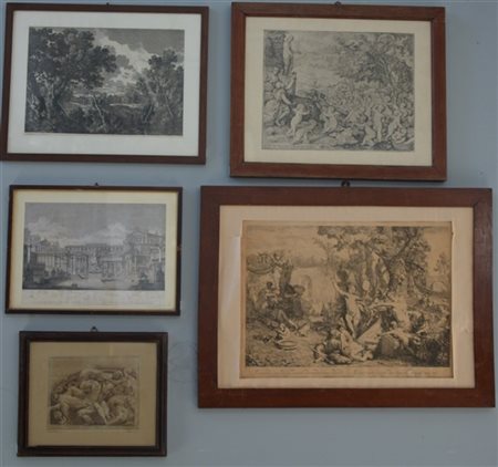 Lotto composto da cinque incisioni soggetti e misure diverse. In cornici (difet