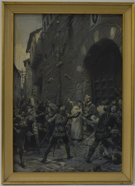 Lodovico Pogliaghi "Saccheggio della casa dei Torriani" olio su cartone pressato