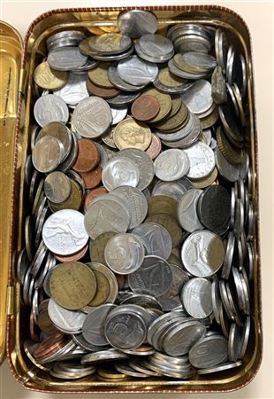 Scatola in latta contenente numerose monete per lo più lire (difetti)