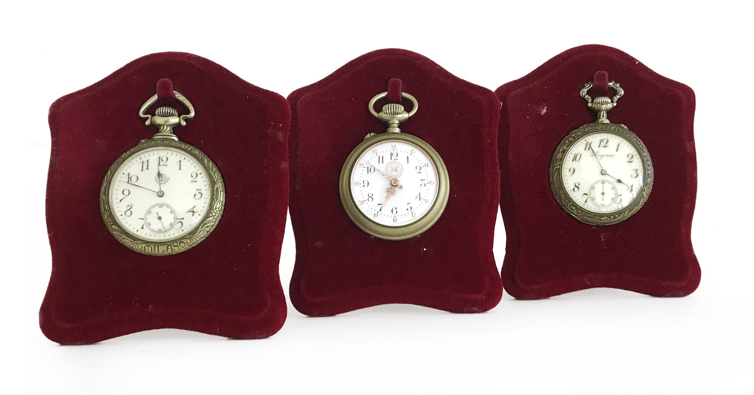 Lotto composto da tre orologi da tasca con cassa in metallo, su pannello in velluto rosso