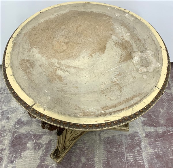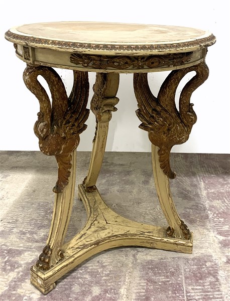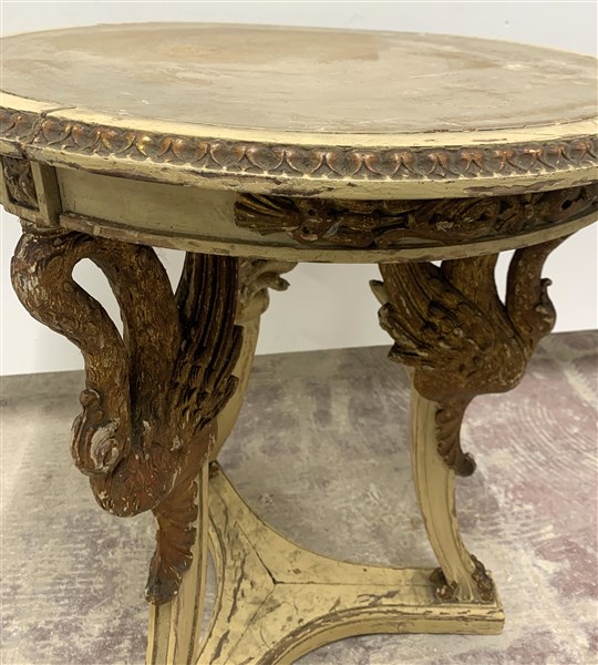 Gueridon in legno laccato e dorato, fascia intagliata a motivi vegetali, gambe sagomate scolpite a forma di cigni (d cm 65 x h cm 80) (difetti, restauri e mancanze)