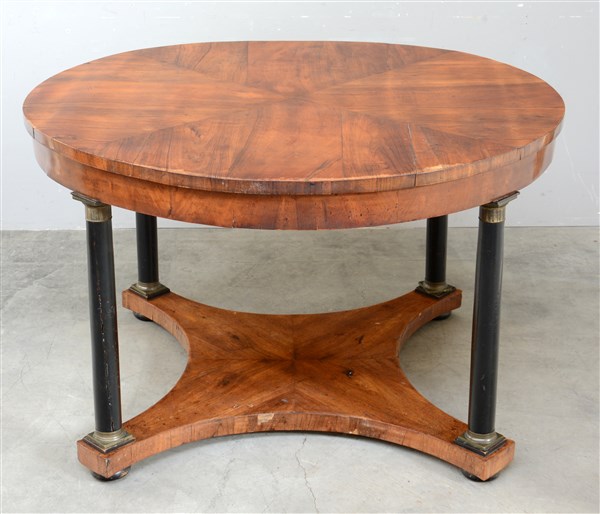Tavolo "Impero" di forma tonda con piano e fascia lastronati in noce, gambe a colonne ebanizzate decorate da capitelli in metallo dorato, riunite da piano sagomato (d. cm 136x h. cm 83) (difetti)