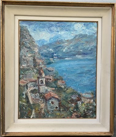 "Lago di Garda"1973, olio su compensato (cm 51x40) Firmato in basso a destra. Al retro: firmato, datato e titolato. In cornice