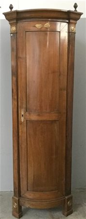Angoliera in noce con sportello convesso pannellato, piedi a plinto e guarnizioni in lamiera dorata. Secolo XIX (cm 72x205x53) (difetti)