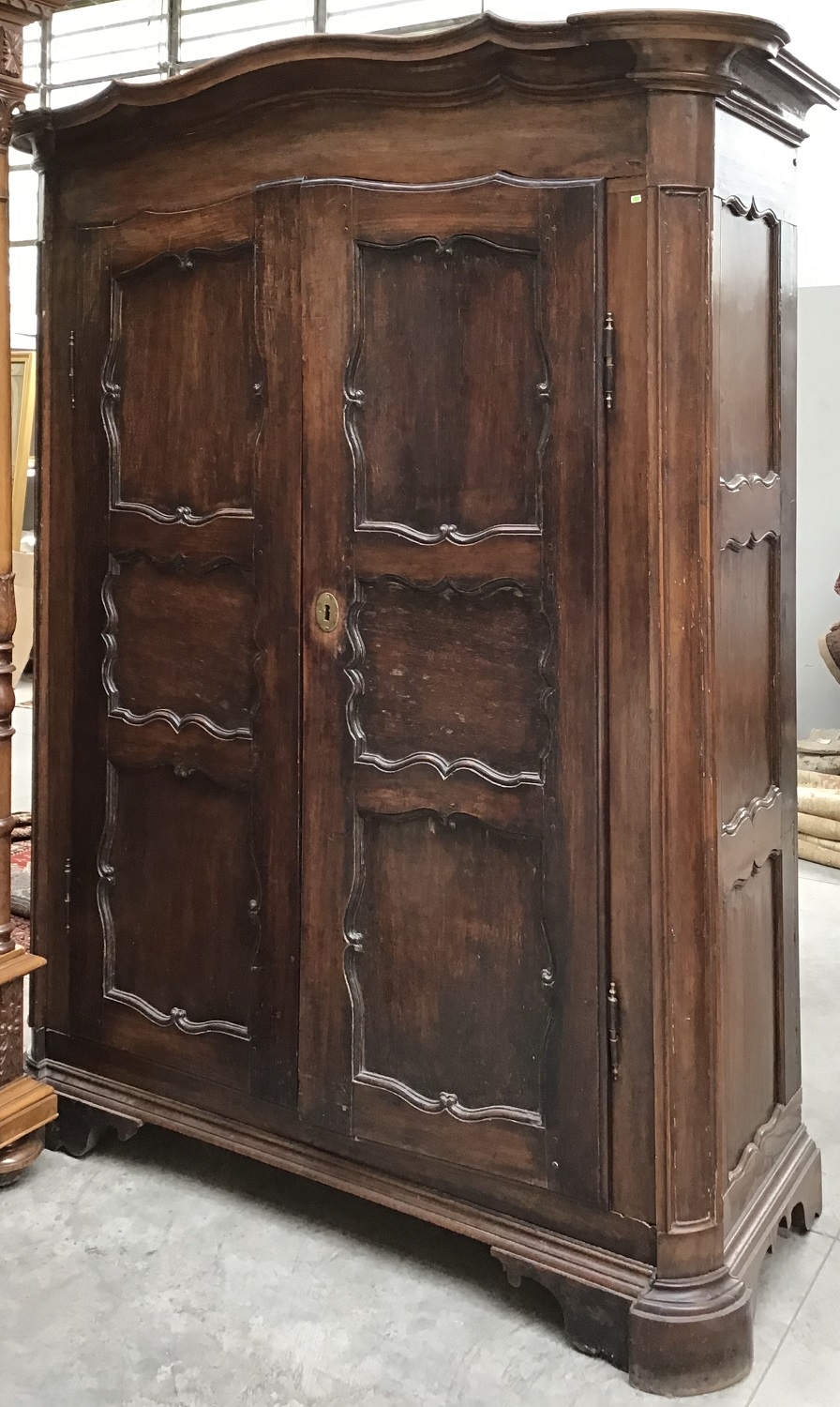 Antico armadio "Provenzale" a due ante decorato sul fronte e sui fianchi con riquadri sagomati. Cappello di forma mossa (cm 167x206x68) (difetti)