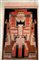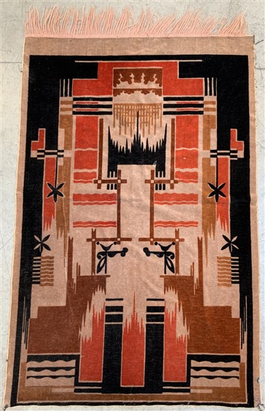 Tappeto da tavolo in velluto di lana, manifattura meccanica, Europa oeriodo del movimento futurista, inizio secolo XX. Decoro geometrico nei toni del rosso, ruggine, nocciola nero e bianco. Foderato.(cm 138x89) (lievi difetti)