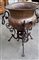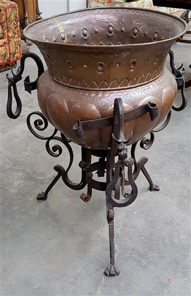 Fioriera tripode in ferro battuto a volute e teste di drago, vasca in rame sbalzato (h cm 78) (difetti)