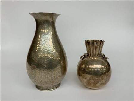 Lotto composto da un vaso in argento a corpo martellinato ed uno biansato in argento con bocca costolata (g 980) (h cm 25 e 16) (difetti)