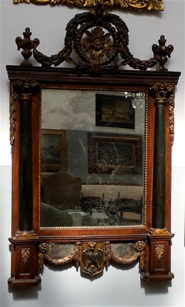 Antica specchiera in legno con montanti a semicolonna ebanizzata, cimasa decora