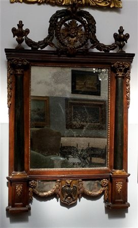 Antica specchiera in legno con montanti a semicolonna ebanizzata, cimasa decorata con fiori e festoni in legno intagliato e dorato, fascia inferiore centrata da scudo con aquila (cm 93x150x10) (difetti e restauri)