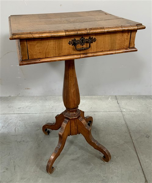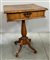 Tavolino da lavoro con piano intarsiato a motivi vegetali. Sostegno a colonna sfaccettata con quattro piedi sagomati, cassetto nella fascia con divisori interni. Secolo XIX (cm 50x75x41) (difetti)