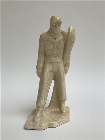 Emaux de Louviere "Sciatore" Scultura in ceramica smaltata in bianco craquele. F
