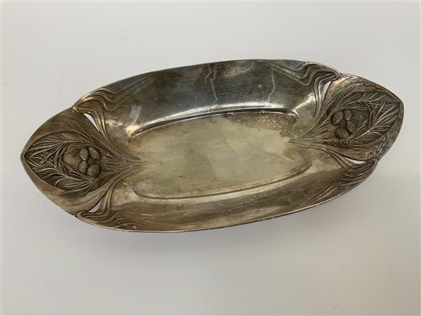 Manifattura Christofle, France, centrotavola Liberty in metallo argentato decorato con rami di conifere e pigne, marcato sotto la base (l cm 36) (lievi difetti)