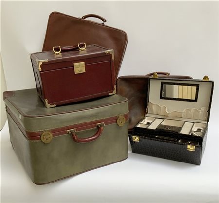 Lotto composto da due beaty case, un portagioie a vari comparti, due ventiquattroore e una valiga in pelle (tg. varie) (difetti e mancanze)
