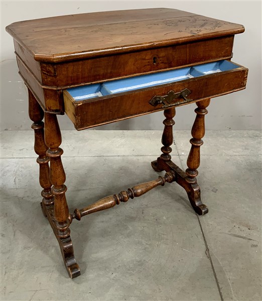 Tavolino da lavoro con sostegni torniti, cassetto nella fascia e piano apribile