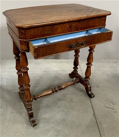 Tavolino da lavoro con sostegni torniti, cassetto nella fascia e piano apribile. Secolo XIX (cm 60x71x40) (difetti e mancanze)