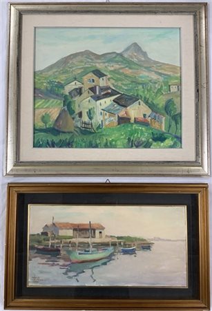 Lotto di due dipinti ad olio su tela raffiguranti un paesaggio montano di ignoto ed uno scorcio di Chioggia firmato Felice Castelli, misure differenti, in cornici
