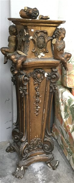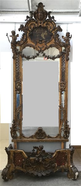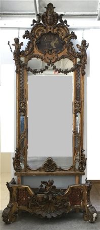 Grande specchiera da ingresso con fioriera alla base. Struttura in legno intagliato e pastiglia, decori a volute, festoni e angioletti a tutto tondo, cimasa arricchita da un dipinto ad olio su tavola raffigurante una scena galante (cm 140x 320 circa). Unita a una colonna portavasi en suite (gravi difetti e mancanze)