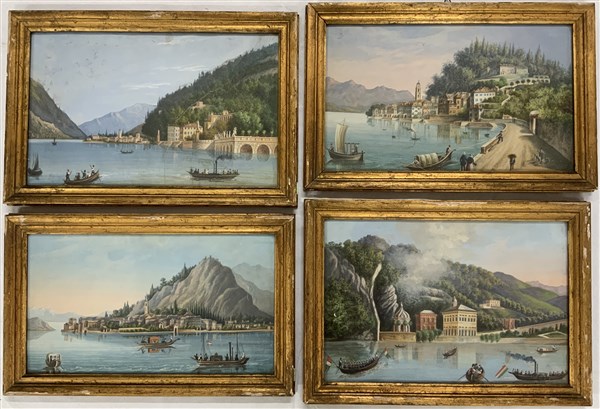Artista del secolo XIX - Gruppo di quattro guaches su carta raffiguranti paesaggi lacustri del Nord Italia (cm 21x32), in cornici (difetti e mancanze)