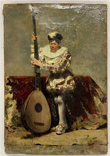 "Giullare", olio su tela (cm 32x22) Firmato in basso a destra (gravi difetti)