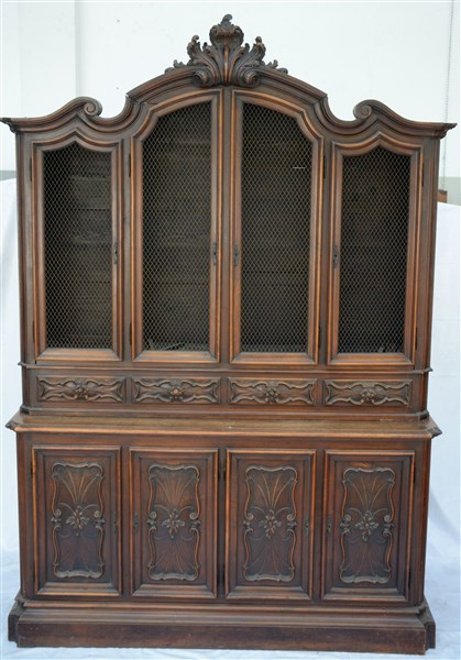 Mobile a due corpi con parte superiore a quattro ante con rete e quattro cassetti nella fascia, parte inferiore a quattro ante. Decorato a pannelli intagliati a motivi barocchi piemontesi (cm190x277x52)(difetti)