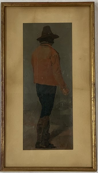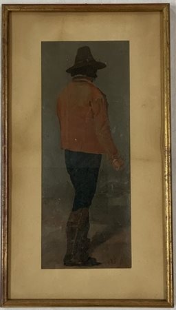 Firma indecifrata, "Figura maschile di spalle", olio su carta applicata su cartone (cm 30x12), siglato in basso a destra, in cornice (difetti)