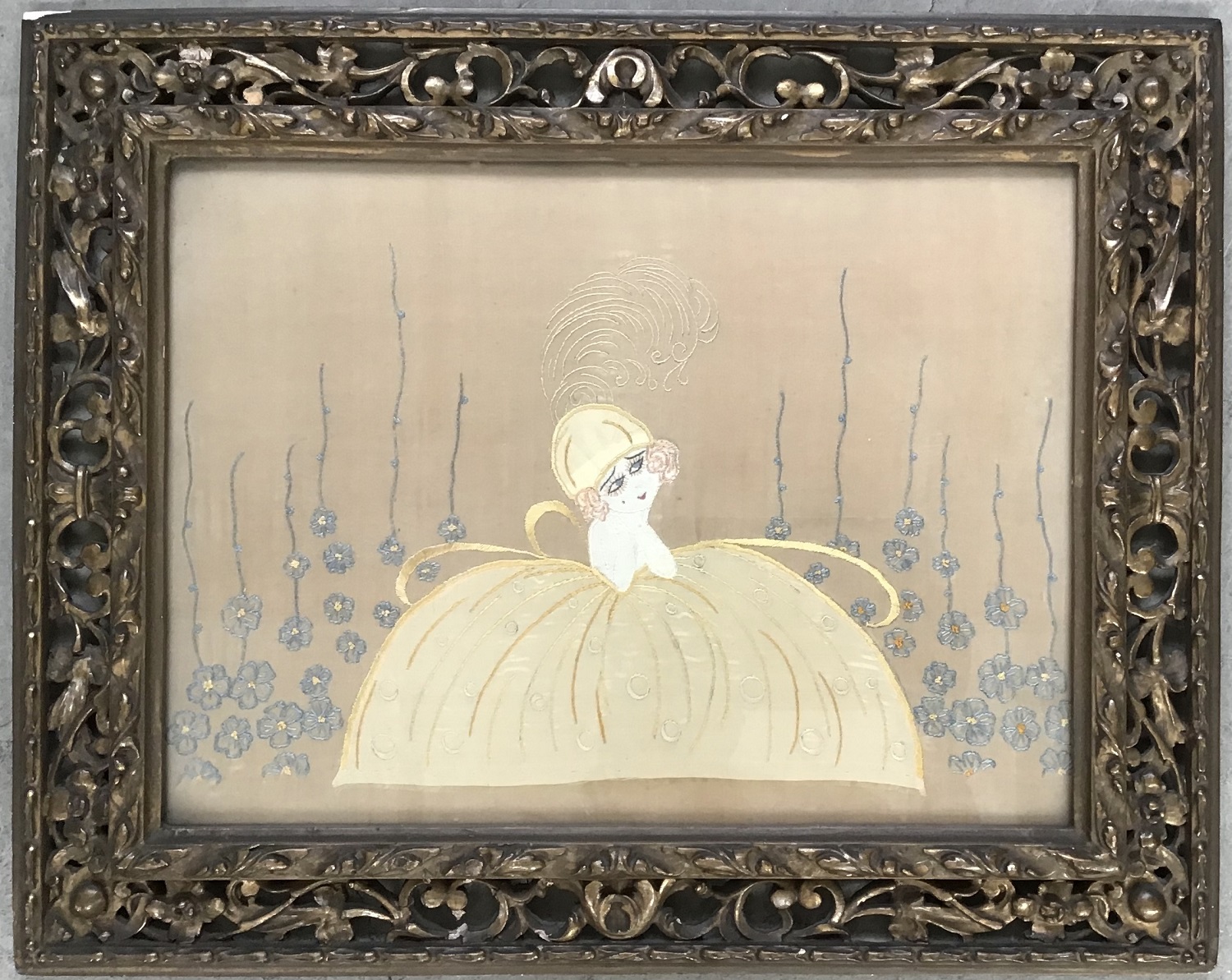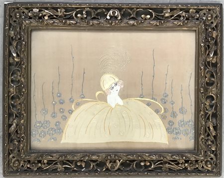 Ricamo in seta su raso di seta color camoscio di stile liberty raffigurante damina.