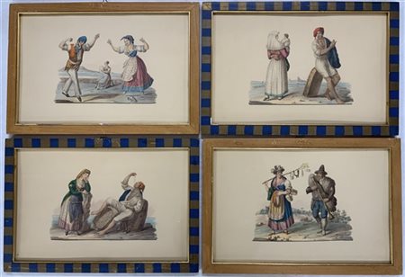 Gruppo di quattro acquerelli raffiguranti scene di genere (fogli cm 27x41), in
