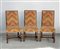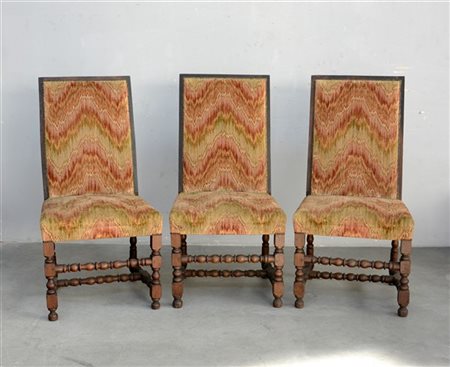 Gruppo di tre sedie in noce con gambe traverse e tornite a rocchetto e schienale squadrato. Secolo XVII (difetti)