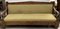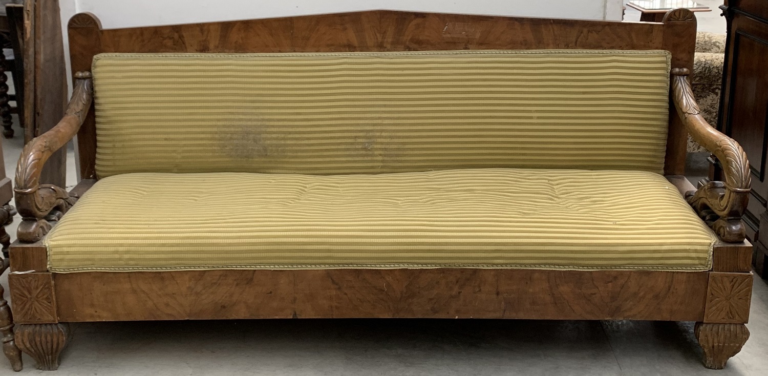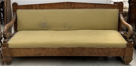 Divano a tre posti lastronato in noce con braccioli mossi e intagliati a motivi fogliacei, seduta e spalliera rivestite in tessuto giallo. Secolo XIX (cm 210x97x65) (difetti e mancanze)