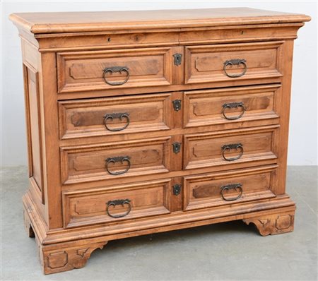 Cassettone in noce a quattro cassetti, fianchi pannellati e due cassetti segreti nella fascia superiore. Maniglie sagomate in ferro battuto (cm 130x110x58)