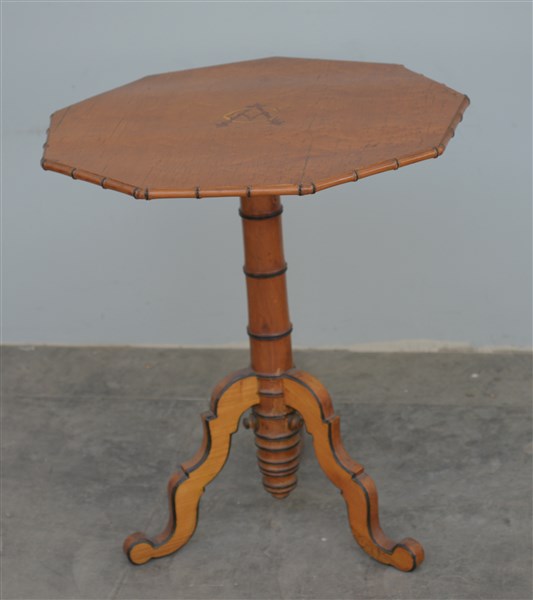 Tavolino con piano ottagonale a "vela", tre piedi a sagoma. Piano con monogramma AC con profilo in bamboo, sec. XIX (cm 68x76x68) (difetti)