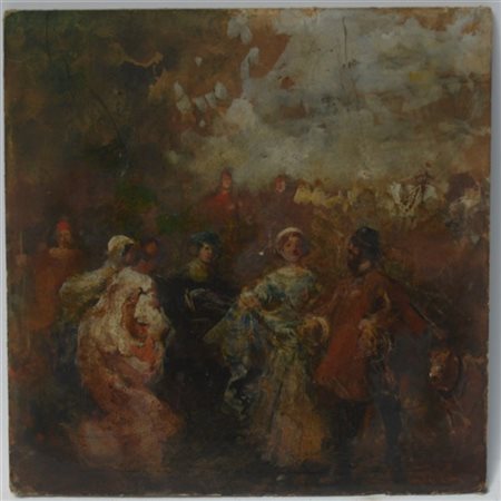 Ignoto del XIX Secolo "L'incontro" olio su cartone (cm 27x26.5) (difetti)