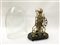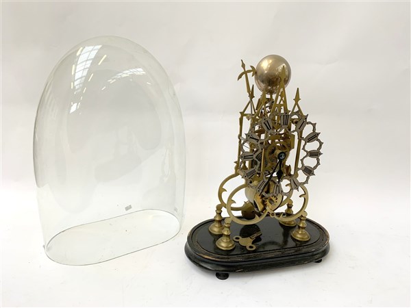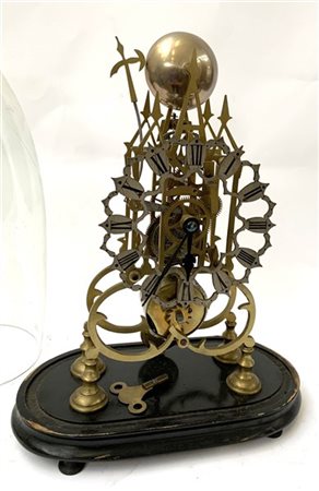 ANONIMO, Inghilterra. Orologio “a scheletro” in ottone di gusto neogotico su base di legno ebanizzato sotto campana di vetro (non pertinente). Epoca fine secolo XIX/inizio secolo XX. Movimento a un treno con scappamento ad ancora a rinculo e rintocco singolo su campanello al passaggio dell’ora.. Quadrante traforato e argentato con numeri romani. Misura h. cm 33 (solo meccanismo). (lievi difetti)