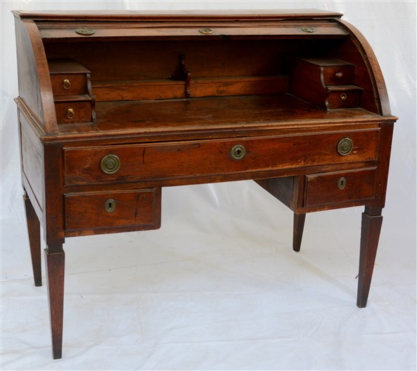 Scrittoio a rullo in noce con anta a saracinesca celante quattro cassettini e vani, un cassetto sottopiano e due laterali, gambe rastremate, secolo XIX (cm 132x114x68) (difetti e restauri)