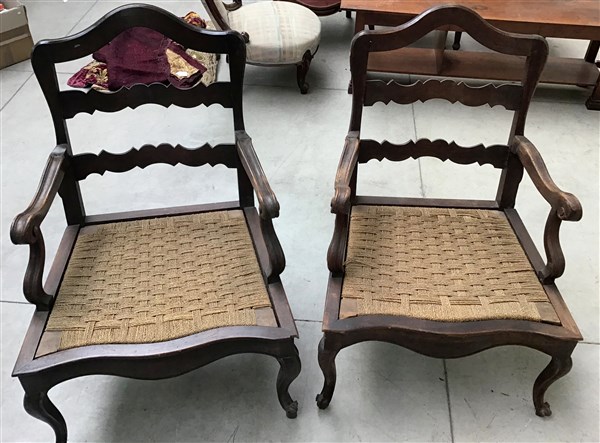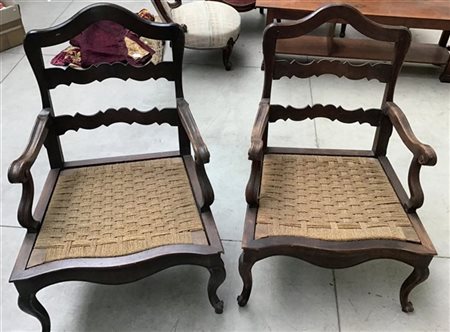 Coppia di poltrone con schienale a giorno, braccioli, fascia e gambe sagomate, sedute impagliate (difetti)