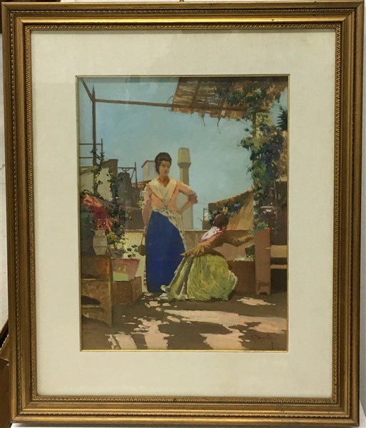 G.Morelli "Figure sotto il pergolato" olio su compensato (cm 40x31) firmato in basso a destra, in cornice
