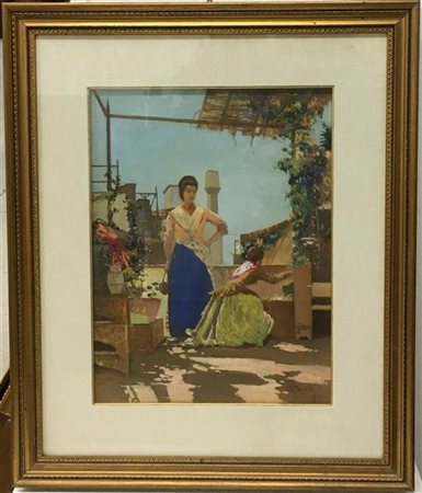 G. Morelli G.Morelli "Figure sotto il pergolato" olio su compensato (cm 40x31) f