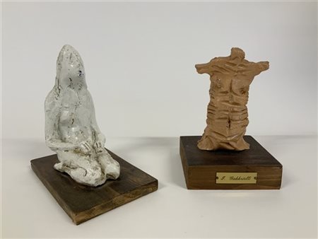 Lotto di due sculture in ceramica dipinta raffiguranti un busto maschile e un nudo femminile assiso di autori diversi