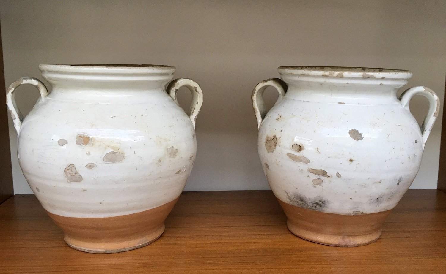 Coppia di vasi biansati in terracotta smaltata (h cm 20) (difetti)