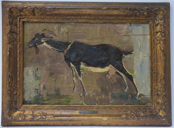 Ignoto della fine del XIX Secolo "La capretta" olio su tela (cm 35x53) Reca firma non coeva V. De Stefani in alto a destra. In cornice (difetti)