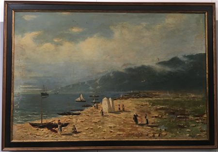 Ignoto "Sulla spiaggia" olio su tela (cm 100x152) tracce di firma in basso a destra, in cornice