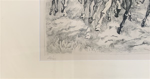 Firma indecifrata, incisione monocroma raffigurante cavalli in libertà, firmata