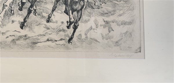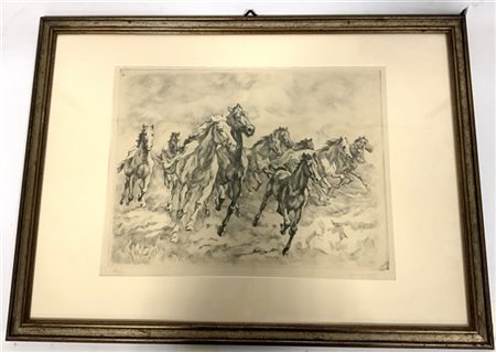 Firma indecifrata, incisione monocroma raffigurante cavalli in libertà, firmata (cm 43x60), in cornice (difetti)