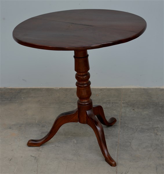 Tavolino con piano tondo a vela, gamba centrale tornita terminante a tre piedi