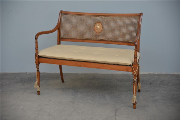Divanetto con schienale decorato da placca dipinta a fiori, montanti a gambe sagomate, rivestito in cannette (difetti)