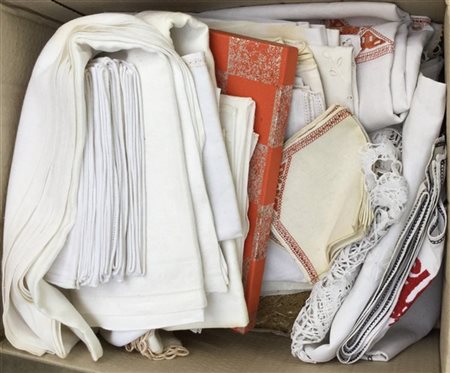 Cartone contenente centrini in pizzo al tombolo, sottobicchieri, copro vassoio, tovaglie in fiandra con tovaglioli più un tessuto in seta e fili metallico dorati e argentati con frange di manifattura giapponese. Inizi secolo XX.
