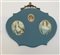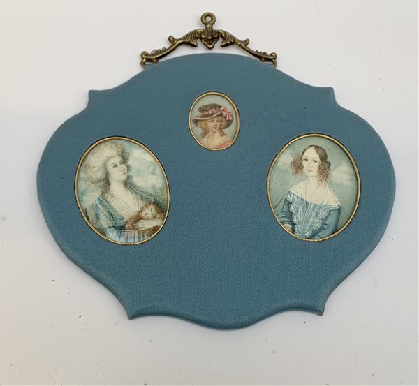 Gruppo di tre miniature raffiguranti gentildonne in un'unica cornice sagomata